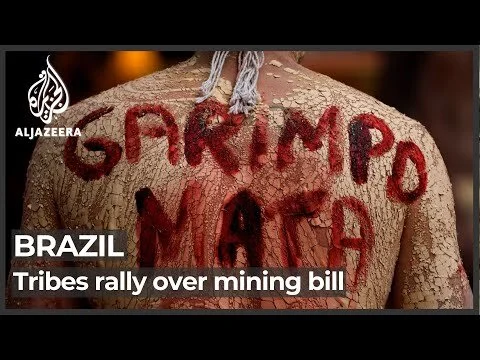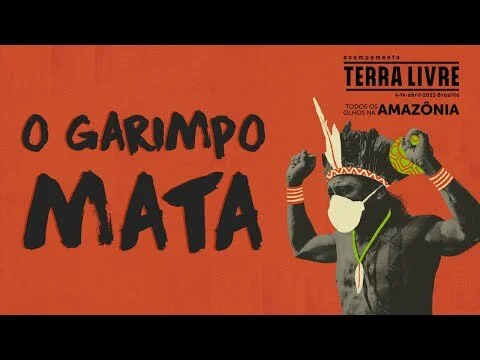 Indigenous leaderships and activists protested in Brasília against the Bill 191, that aims to legalize illegal mining in indigenous lands, by marching to ministries buildings full of mud and fake blood, representing the death toll, violence and suffering caused by illegal mining. In front of the Ministry of Mines and Energy, gold bars with the word "crime" on them were placed, alongside a giant banner created by the artist Ibraim Nascimento with the aid of Indigenous People from the camp.